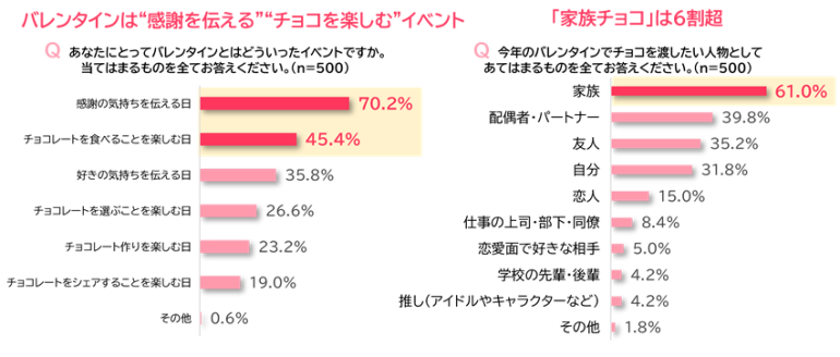 こうした変化は、データにも表れている。先日、ロッテ が発表した「バレンタインに関する意識調査」(全国の10〜50代女性500人対象)によると、バレンタインは「感謝を伝える日」「チョコレートを食べることを楽しむ日」として捉えられる傾向が強まっているという。