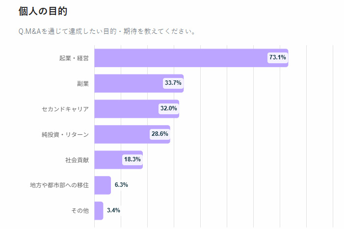皿谷: バトンズの調査データを見ても、M&Aを通じて達成したい目的として「起業・経営」が73.1%とトップですが、「副業(33.7%)」や「セカンドキャリア(32.0%)」という回答も上位に並んでいます。