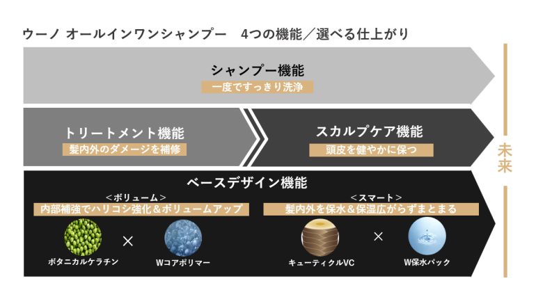 「ウーノ オールインワンシャンプー」では、今も未来もカッコいい髪でいるため、以下の4つの機能でトータルケアする。