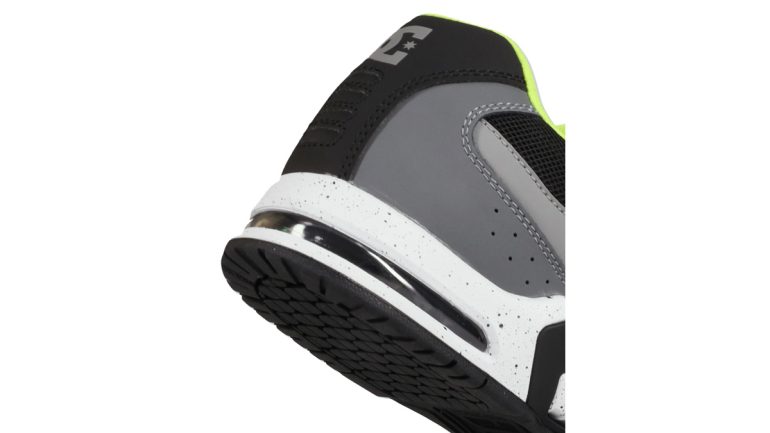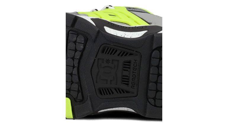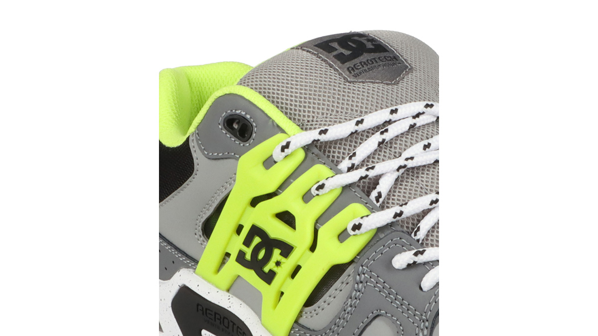 サイドを包み込むTPUケージで横方向の安定性が向上し、メッシュインサートで高い通気性を確保。DCのビッグロゴもポイント。暑い時期や長時間の着用でも蒸れにくく、クールで快適な履き心地をキープする。