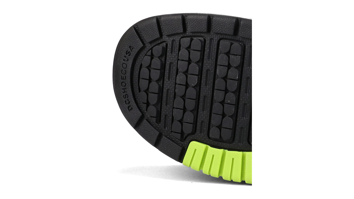 衝撃吸収性と耐摩耗性に優れたスティッキー ラバーアウトソールにDCの商標である「ピルパターン」トレッドを採用。