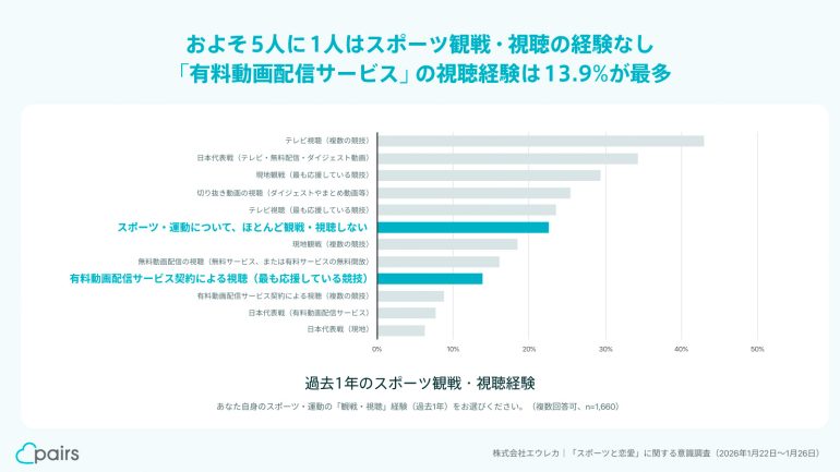 恋活・婚活マッチングアプリ「Pairs(ペアーズ)」を運営するエウレカはこのほど、ペアーズユーザー(有効回答:1660人)を対象に「スポーツと恋愛」に関する意識調査を実施し、その結果を発表した。