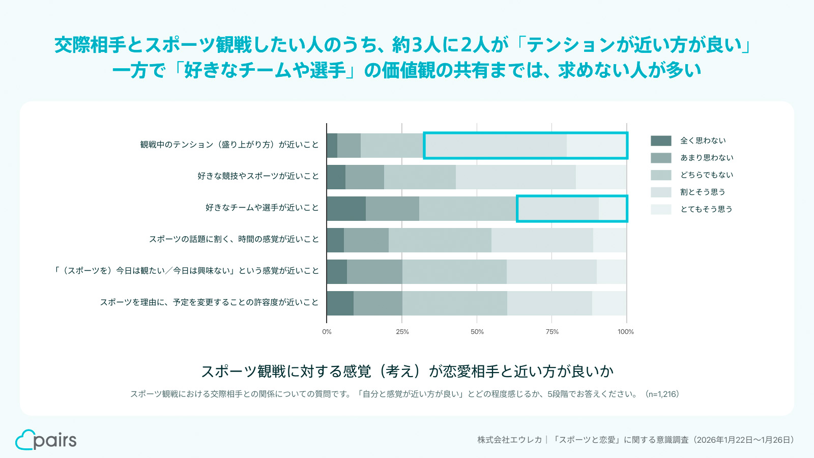 続いて、前問で「交際相手と観戦したい」と回答した1216人の、自分と相手のスポーツ観戦に対する感覚(考え)が近い方がよいかどうか、6項目について5段階評価を集計した。