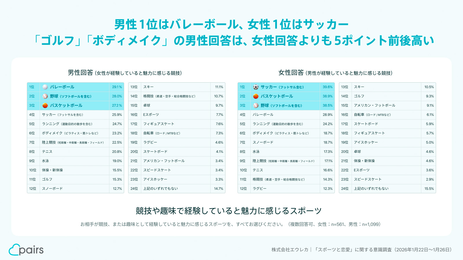 競技や趣味で経験していると相手が魅力に感じるスポーツ、男性回答1位は「バレーボール」、女性回答1位は
