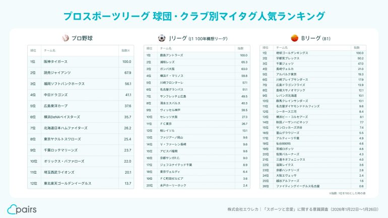 ※2 NPBの12球団、J1 百年構想リーグの20クラブ、Bリーグ B1の26クラブを集計。マイタグは、最も登録ユーザー数が多いタグをピックアップして、各競技別の球団・クラブ最多登録数を100として指数化。