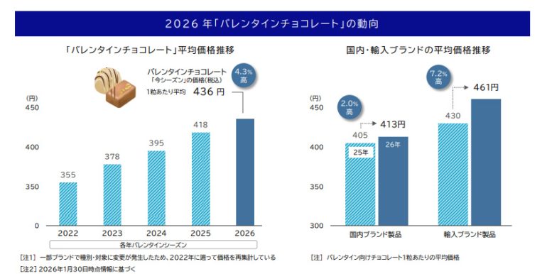 帝国データバンクによる調査によると、全国の百貨店やショッピングモールなどで販売されている2026年のバレンタインチョコは1粒あたり平均436円となり、前年から4.3%上昇して過去最高を更新した。国内ブランド品は平均413円、輸入ブランド品は平均461円と、いずれも上昇している。
