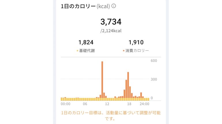 11時台に消費カロリーが突出し、600カロリーにまで達している。これは近所をジョギングしたためだ。また、この日の18時台には水泳にも行ったため、かなり多くのカロリーを消費することができた。結果、1日の消費カロリーは3.700カロリーに到達。