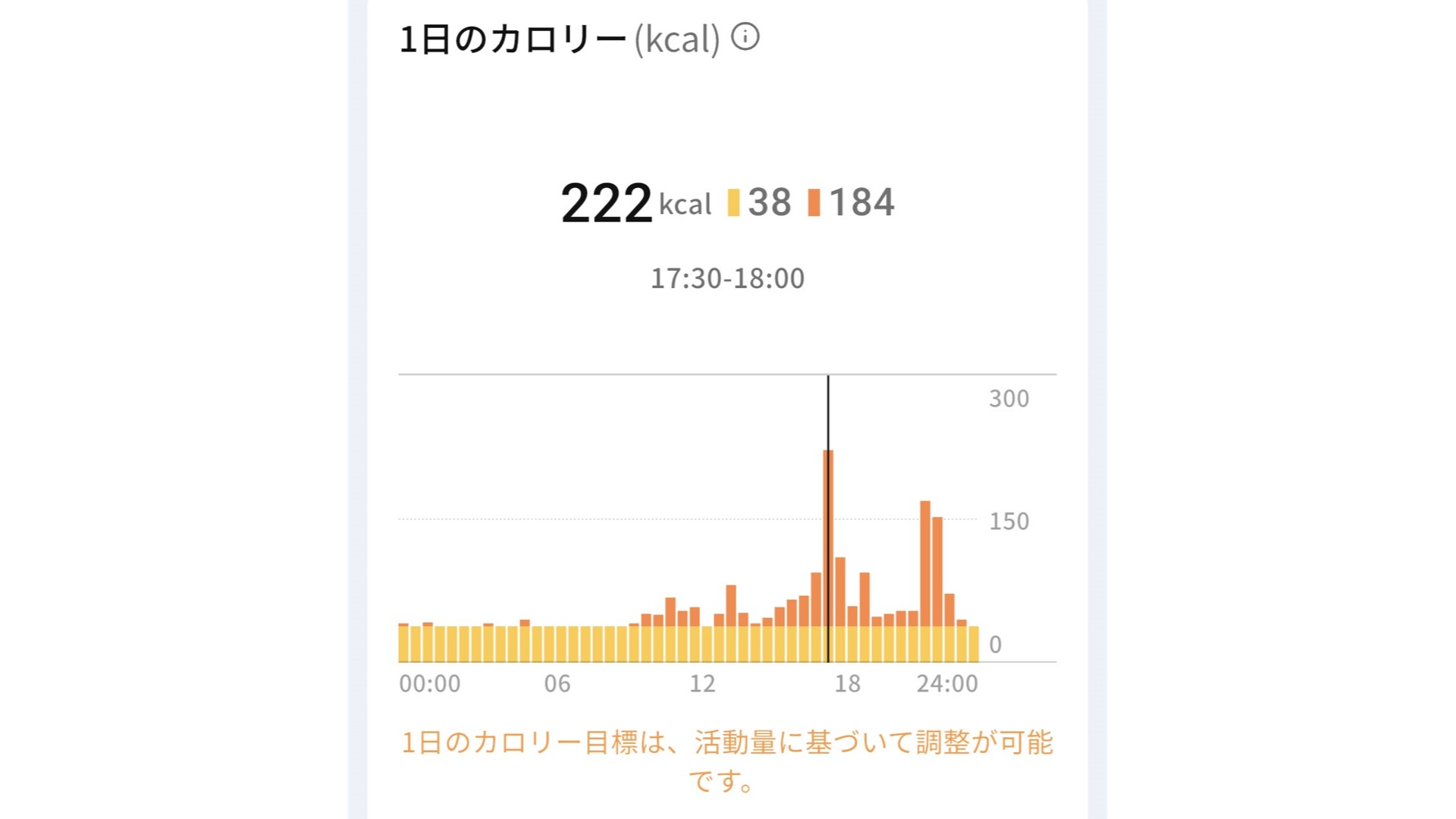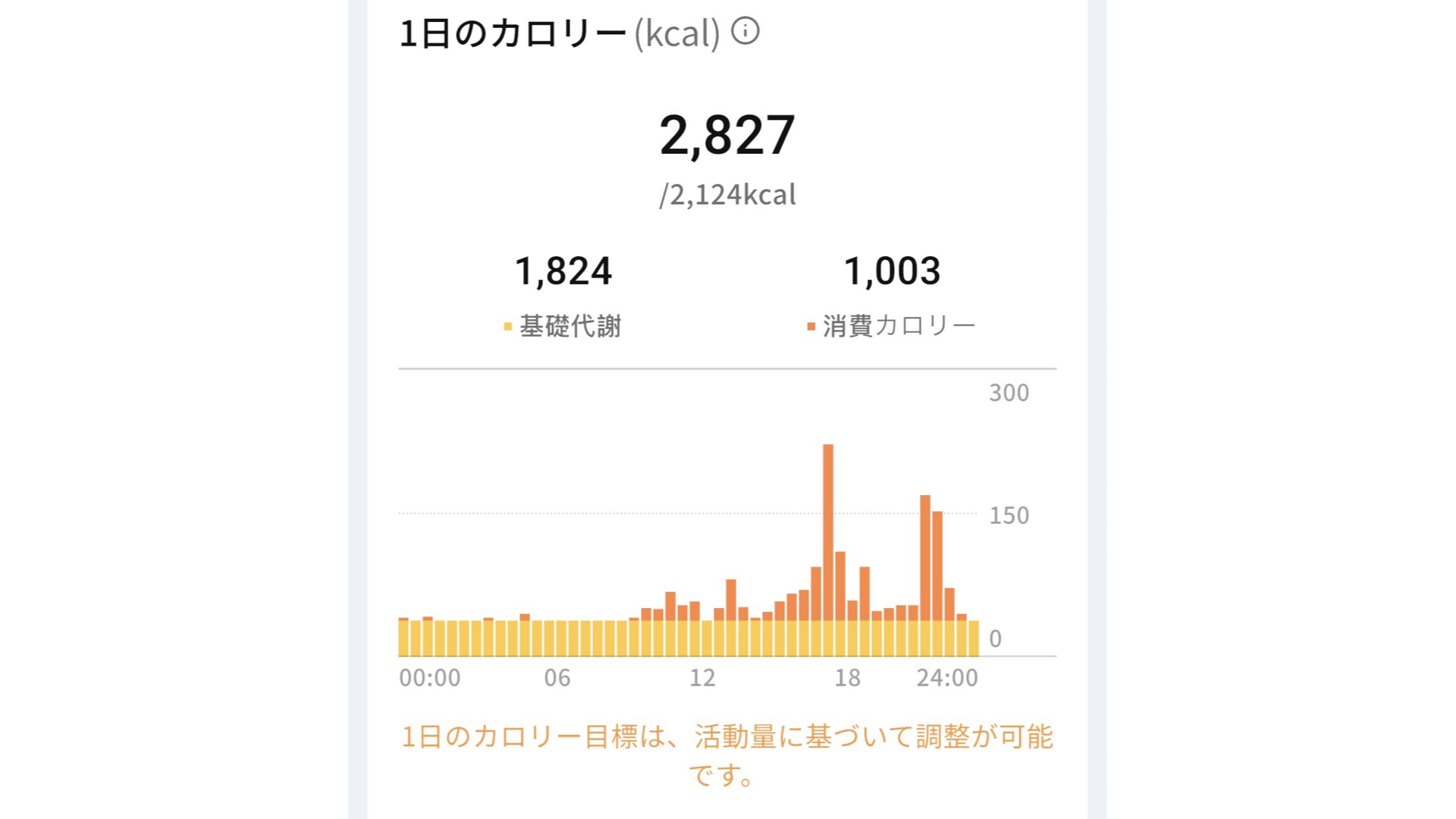 11時台に消費カロリーが突出し、600カロリーにまで達している。これは近所をジョギングしたためだ。また、この日の18時台には水泳にも行ったため、かなり多くのカロリーを消費することができた。結果、1日の消費カロリーは3.700カロリーに到達。