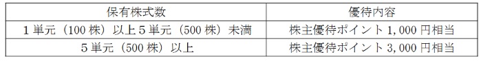 もらえる株主優待は、100株で株主優待ポイント1,000円相当がもらえ、500株では3,000円相当。ただし、「1年以上継続して保有」が必要で、初回基準日2026年3月末の対象者は、2025年3月末、9月末、2026年3月末の基準日に100株以上を同一株主番号で連続記載されていなければならない。
