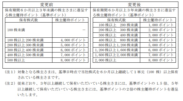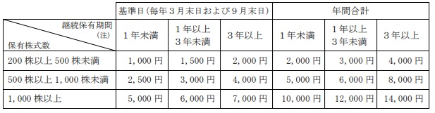 200株保有で、1年未満なら1,000円分(年間2,000円分)、1年以上3年未満なら1,500円(年間3,000円)、3年以上なら2,000円(年間4,000円)。保有年数によってもらえる額が増える「育つ優待」だ。500株では2,500円分~4,000円分(年間5,000円~8,000円)になる。