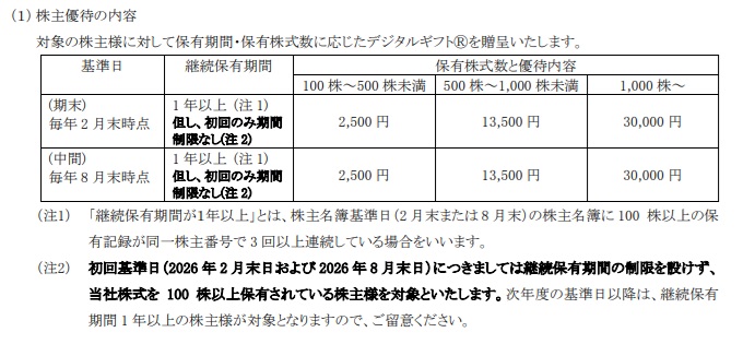 8月権利:100株保有で2,500円、500株保有で1万3,500円、1,000株保有で3万円のデジタルギフト※初回(2026年8月)は期間制限なし