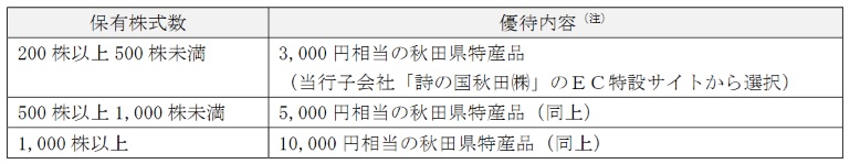秋田銀行が1月28日に株主優待を新設すると発表した。株主優待の内容は、200株で3,000円相当の秋田県特産品。500株では5,000円相当、1,000株では1万円相当にアップする。