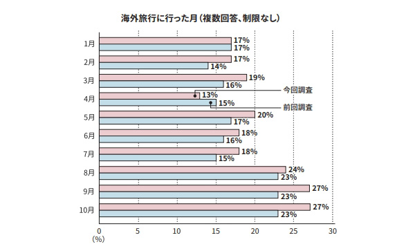 2025年に海外旅行をした時期は、9月と10月が最も多くいずれも27%となり、旅行価格が高くなるお盆休みを避け、遅めの夏休みを取られている人が多いことがうかがえる。夏休み前の月も1月と4月以外は前年より増加傾向にあり、時期を分散する傾向は強まっているように見える。
