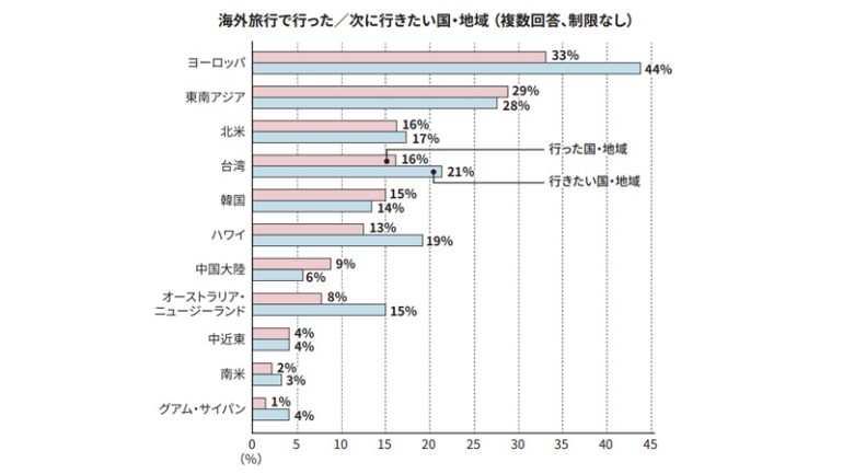 海外旅行に行った国・地域では、ヨーロッパが最も多く33%、次いで東南アジアが29%となった。次に行きたい国・地域もヨーロッパが最も多く44%まで伸び、東南アジアは行った人の割合とほぼ同率の28%となった。台湾やハワイ、オーストラリア・ニュージーランドは行ったと回答した人より、次に行きたいと回答した人が5ポイント以上多い結果となった。