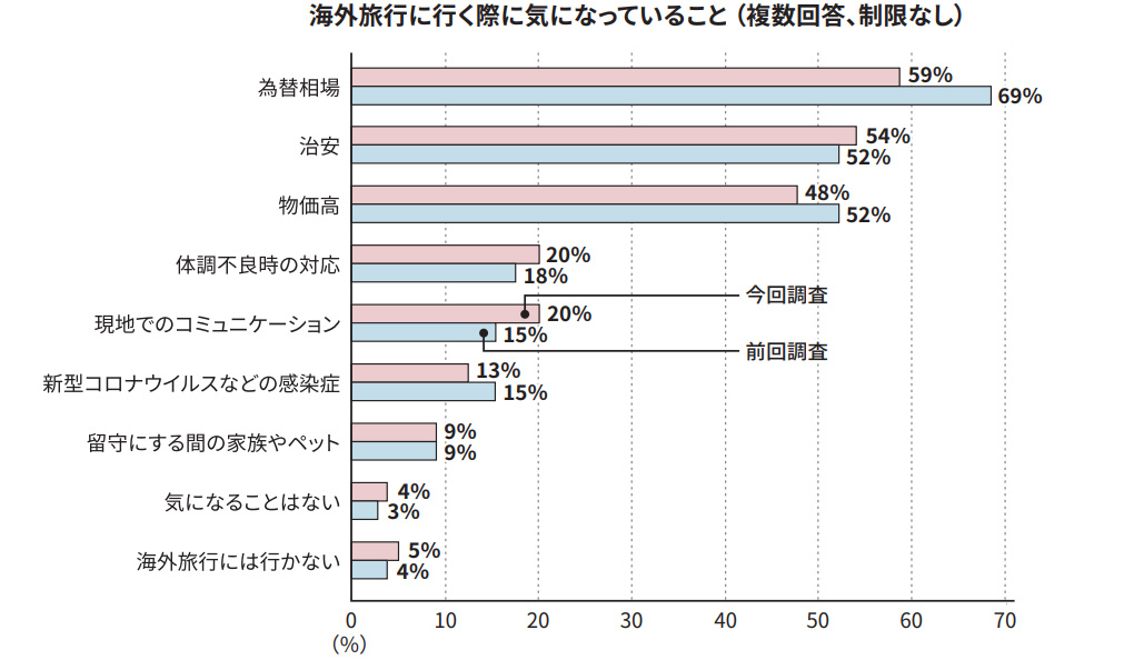 海外旅行で気になっていることは「為替相場」が前年より10ポイント減少したものの59%と依然最も高い結果となった。「治安」が前年より2ポイント伸び54%、「物価高」は4ポイント減少し48%となり、「物価」より「治安」が上回る結果となった。