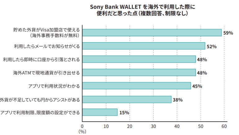 Sony Bank WALLET の海外利用において、「貯めた外貨が海外事務手数料無料でVisa加盟店で使える」という点が便利だったと回答した人が59%を占め、前年と同様に最も多い結果となった。