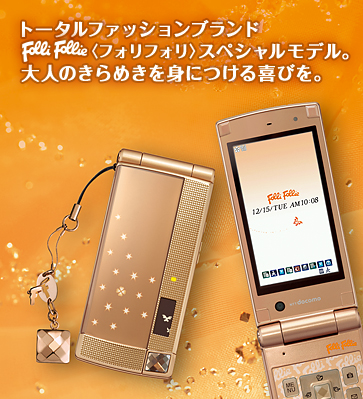 F-02BはゴールドがFolli Follieとのコラボケータイで、外見だけじゃなくメニュー画面などの中身もFolli Follieデザイン!限定ストラップも付属していて、持っているだけでステキ女子になれそうな(笑)、そんなキラキラしたケータイでした。