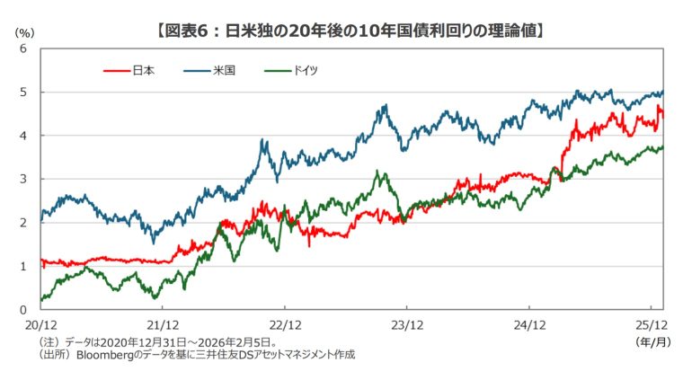 例えば、将来のある時点の金利水準を取引するデリバティブにFRA(Forward Rate Agreement、金利先渡し契約)があるが、日本の20年後の10年国債利回り理論値は足元で約4.4%にまで達している(図表6)。