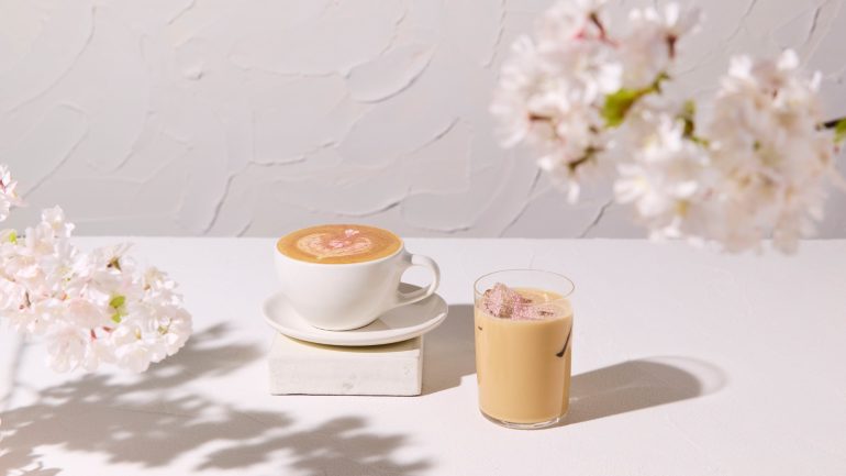 水面を漂う桜の花びらのような見た目も美しいシーズナルラテ。エスプレッソにチェリーブロッサムウォーターを使った特製シロップを合わせ、桜の繊細でフローラルな味わいを満喫できる。
