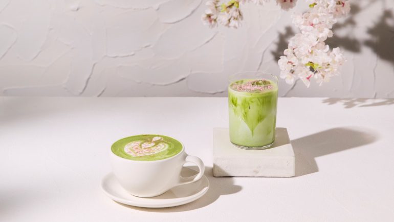 カフェで人気の抹茶ラテにも使われている京都の茶問屋「利招園茶舗(りしょうえんちゃほ)」の京都産抹茶「映緑(えいりょく)」に、チェリーブロッサムシロップを合わせた抹茶チェリーブロッサムラテが新たに登場する。