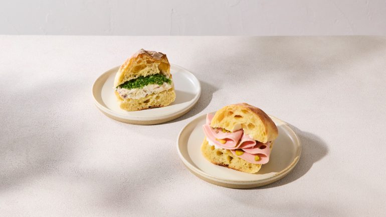 ピスタチオを練り込んだモルタデッラハムと、ギリシャヨーグルトをブレンドしたこだわりのチーズペーストを軽やかな食感が魅力のチャバタでサンド。モルタデッラのまろやかな塩味と、チーズペーストの爽やかな酸味が重なり合う、奥行きのある味わいに仕上げている。