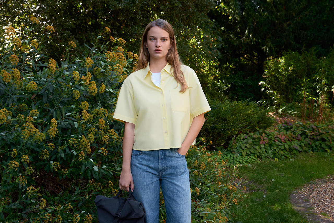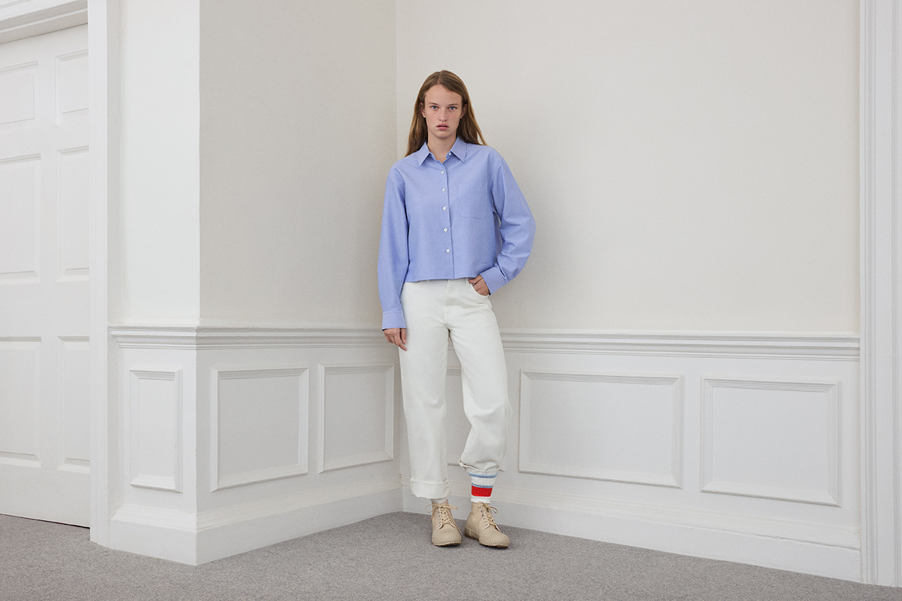 定番のウィメンズオックスフォードシャツには、待望の半袖が登場。イエローやピンクを含む全6色を展開し、ショート丈のボクシーシルエットがモダンな印象を際立たせるデザインだ。