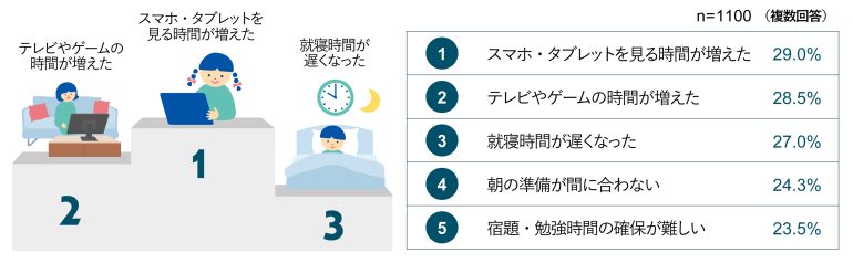 入学後の生活で「困っていること」を尋ねたところ、最も多かったのは「スマホ・タブレットを見る時間が増えた」(29.0%)となった。続いて「テレビやゲームの時間が増えた」(28.5%)、「就寝時間が遅くなった」(27.0%)が上位に並び、デジタル接触や時間管理に悩む家庭が多い実態がうかがえる。