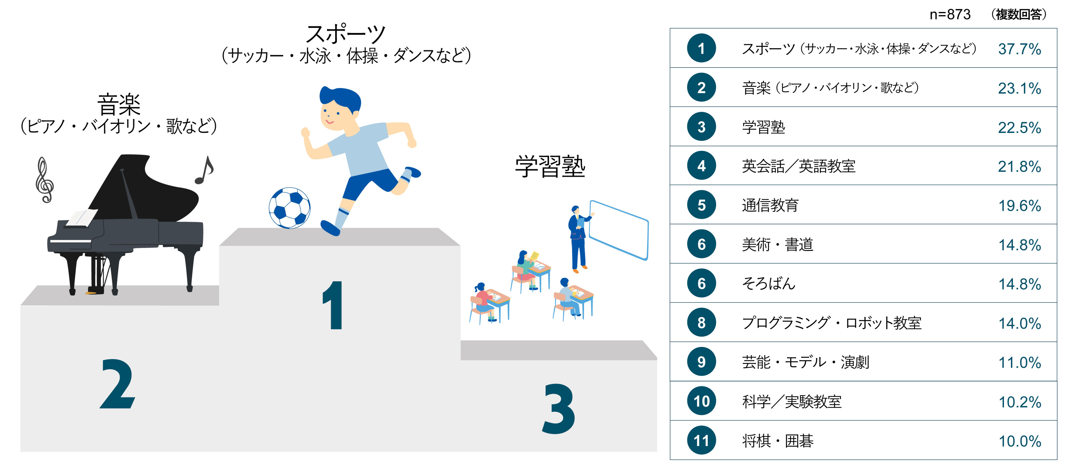 身体を動かす習い事が最多となる一方で、語学や学習系の習い事も上位に入り、小学1年生の段階から「運動」と「学び」の両立を意識した習い事選びが行われている様子がうかがえる。