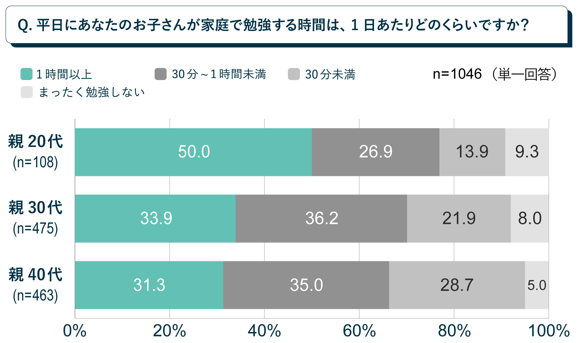 親の年齢別に家庭学習の状況を見ると、親が20代の家庭では、平日に「1時間以上」家庭学習をしている割合が50.0%となり、30代(33.9%)、40代(31.3%)と比べて高い水準となった。