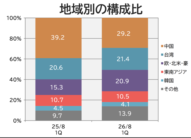 地域別の売上構成を見ると、中国が依然として最大の比率を占める一方、台湾や欧米・豪州の割合が伸びている点が特徴だ。特定の国だけに頼るのではなく、複数地域から安定して需要を取り込めていることが、売上の底堅さにつながっているといえる。