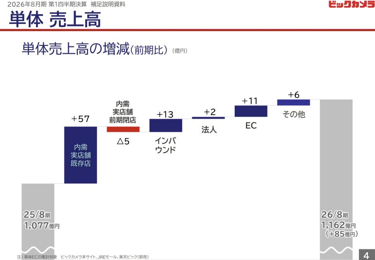 単体売上は前年同期から85億円増加しており、内訳を見ると既存店内需が57億円増、インバウンド関連が13億円増、ECが11億円増となっている。