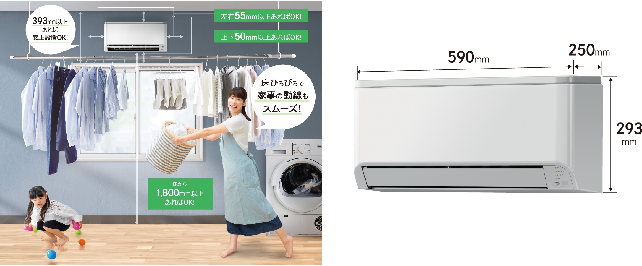 そして誕生したのが、ランドリールームの壁に設置する、日本初(※2)の衣類乾燥除湿機「いつでもカラット」。壁に設置することで、洗濯機や収納棚などで狭くなりがちなランドリールームでも動線を確保できるのはもちろん、窓上にも設置できるコンパクトなサイズなので多様な間取りに対応可能だ。