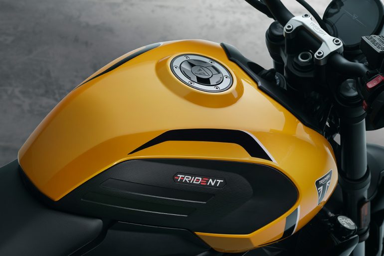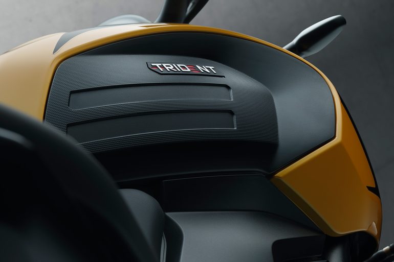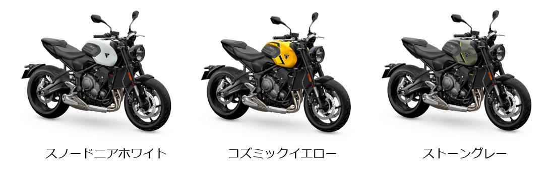 コズミックイエローとストーングレーの2色をプレミアムカラーとして設定し、スタンダードカラーにはスノードニアホワイトを用意。いずれのカラーも、Tridentのモダン・ロードスターとしてのアイデンティティを際立たせる、特徴的なグラフィックが施されている。