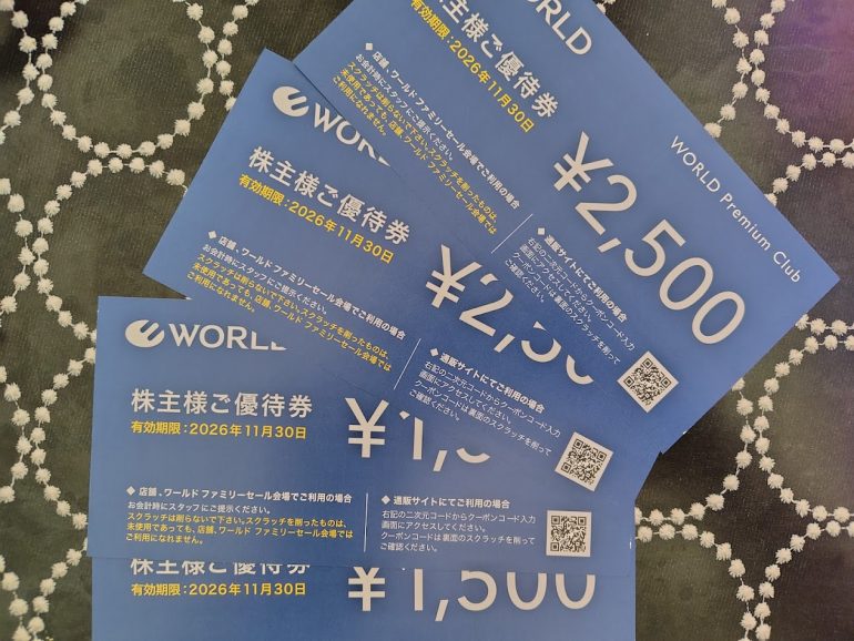 洋服店や雑貨店を展開するワールドの株主優待は、権利月2月、8月。保有株数によってもらえる金券の額が1,500円や2,500円と違っているのだが、使う時にちょっとしたテクニックを使うとこれも1円単位で使えるようになる。