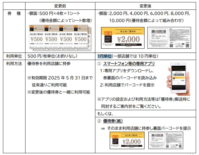 これまで500円券で、支払いは500円ごとに1枚利用できたが、株主優待の変更により1円単位で払えるようになった。※一部店舗では10円単位