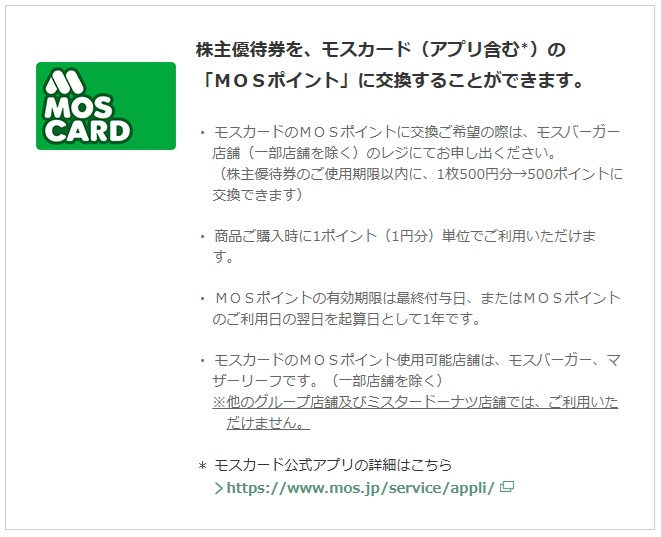 ・店頭のレジで、株主優待券をモスカードのMOSポイントに交換してほしいことを伝える