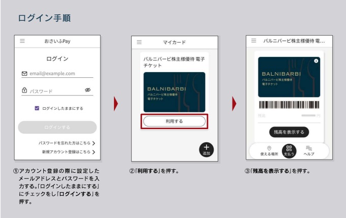 バルニバービの株主優待は、電子チケットの「おさいふPay」でアカウントを登録して食事券を追加すると1円単位で使える。