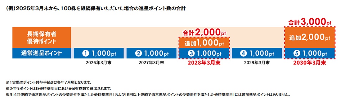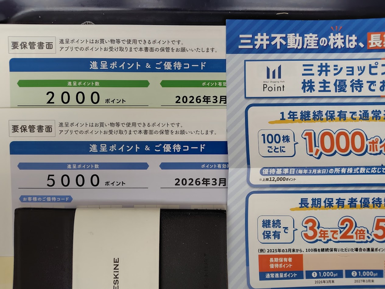 そんな三井不動産の株主優待は、権利月が3月。2025年3月が初回権利で、2026年が2回目の実施となる。所有株式数に応じて三井ショッピングパークポイントをもらえ、100株なら1,000ポイント、200株なら2,000ポイントとなり、1,200株では1万2,000ポイントがもらえる。2026年3月権利は継続1年以上保有が必要なので、今買ったとしても2027年3月権利の扱いになるが、長期保有特典もあり、3回連続で通常進呈ポイント受領要件を満たせば100株ごとに1,000ポイント、5回連続で通常進呈ポイント受領要件を満たせば100株ごとに2,000ポイントがもらえる。