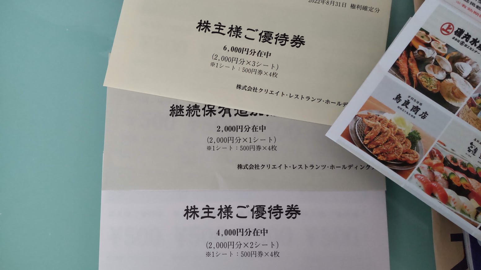 電子化になり1円単位で使えるようになったクリエイト・レストランツ・ホールディングスの株主優待。「磯丸水産」、「しゃぶ菜」、「つけめんTETSU」などの支払いが「みなし0円」になる。権利月は2月、8月だ。