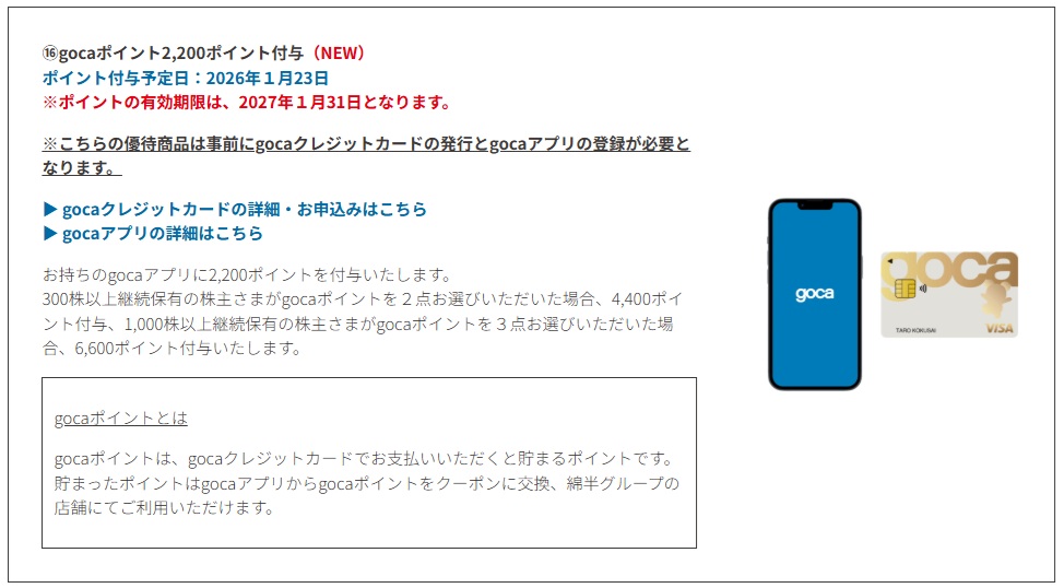 長野県本社の小売店、綿半ホールディングスの株主優待は選択制で、「gocaポイント 2,200ポイント」も選べる。このほか、「gocaプリペイドカード 2,000円チャージ」も選べる。※選択のためには、事前にクレジットカードの発行などの手続きが必要