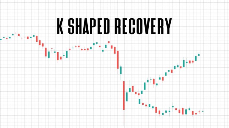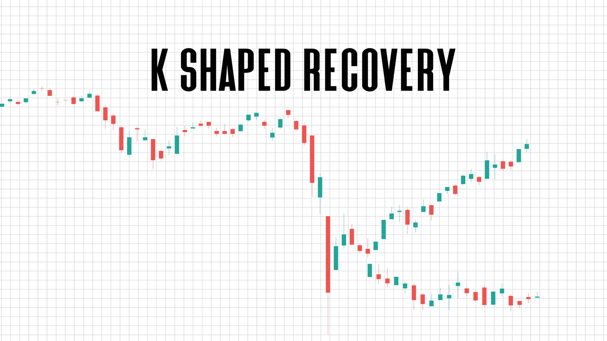 K字型経済とは、景気の回復・拡大が一部の層にとっては右肩上がりに働き、他の層には右肩下がりに働く現象を指します。つまり、K字型経済は高所得者層と低所得者層の格差が極端に広がる状況を表し、「株式や住宅などの資産価格の高騰で豊かになる層」と「インフレの直撃を受けてじり貧になる層」が同時に存在すると説明されています。
