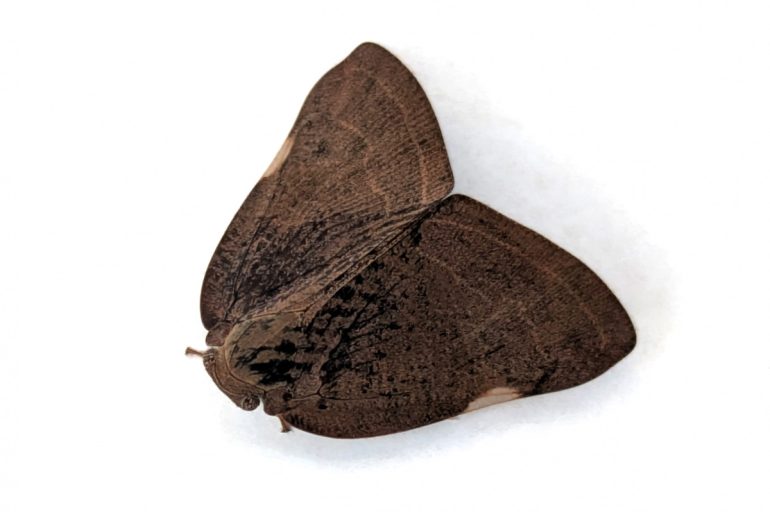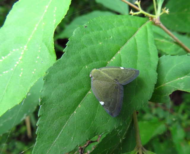 チュウゴクアミガサハゴロモとは、カメムシ目ハゴロモ科の一種で、分類学的にはあの臭い匂いでおなじみのカメムシと同じ仲間です。大きさは1.5cmほどで、茶色い翅に小さな白い三角形の模様があるのが特徴です。幼虫時代は白色で、綿毛状の蝋物質を広げています。