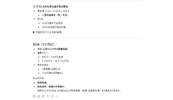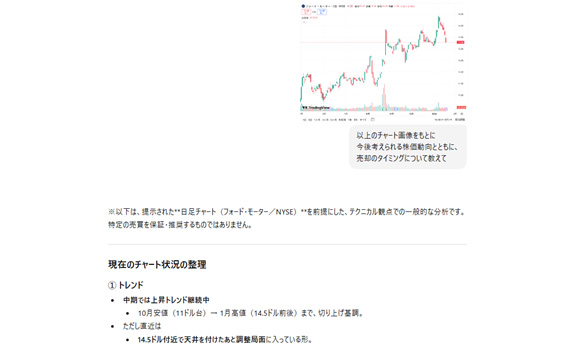 以下は、自動車メーカー・フォード・モーターのチャート画像を読み込ませた結果。14ドル付近で何度か〝跳ね返されている〟ことから成長力に不透明感はあるが、中長期では11ドル台→14ドル台まで上昇。収益基盤は安定、事業継続性に問題はなさそうだが、はたしてAIが出した分析結果は!?
