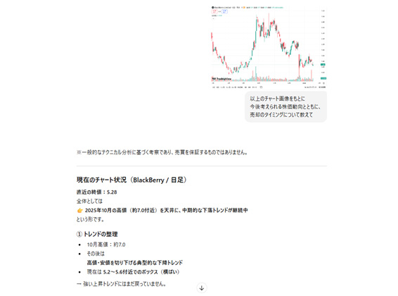以下は、通信端末企業・ブラックベリーのチャート画像を読み込ませた結果。2025年7月~8月にかけては先行きへの不安が高まったためか急落基調に。9月~10月には一時的に急反発したものの、11月以降は、高値を維持できずに下落してしまった。このようなチャートに対して、はたしてAIが出した分析結果は!?