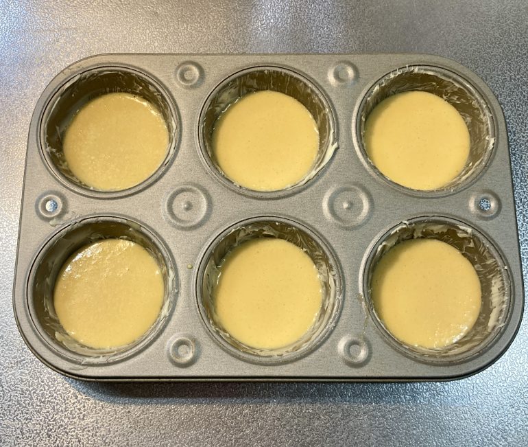 - オーブンを190℃に予熱するあいだ、「3.」の生地を型に流し入れる