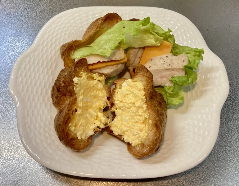 食事として楽しむ場合は、バターやジャムを塗ったり、スープに添えたりとパンのように食べるのが王道です。サンドイッチ風にするなら、縦にカットして具材をはさんでみましょう。鶏ハム、サーモン、玉子などのタンパク質と新鮮な野菜を組み合わせれば、ランチにもぴったりです。