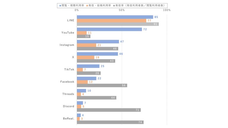 閲覧者のうち発信をしている割合を示す「発信率」では、LINEが91%と最も高く、BeReal.やDiscordも7割を超え高い傾向があった。一方、YouTubeが15%、TikTokは26%と動画を中心とするサービスは低く、閲覧中心の利用であることがわかった。