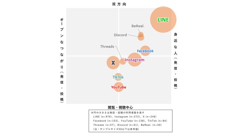 Instagramはその中間にあり、閲覧・発信のどちらにおいても利用が特定方向に偏らず、幅広いつながり方で使われるサービスであることがわかる。 これらの結果から、主要なソーシャルメディアはそれぞれ異なる特徴を持ち、利用者が目的に応じて使い分けている様子が確認できる。