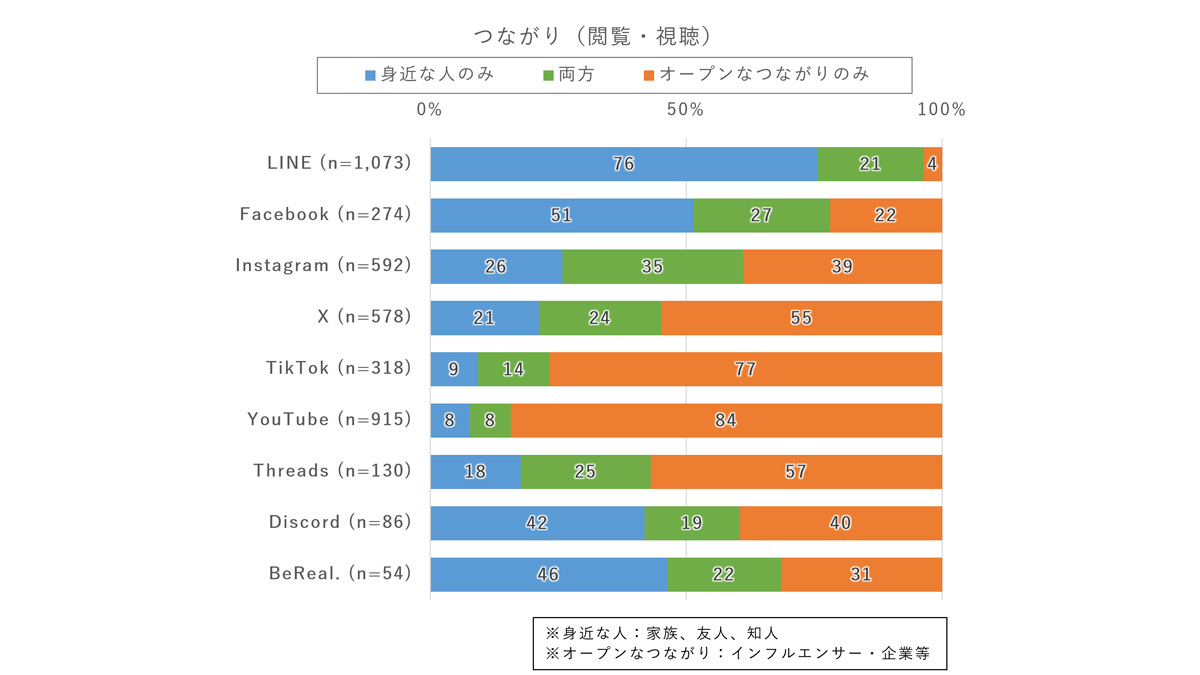 また、Instagramでは、身近な人とオープンなつながりの両方を対象とする利用が見られ、閲覧・視聴と発信・投稿のどちらにおいても、つながりの幅が特定の方向に偏らない使われ方が確認できる。