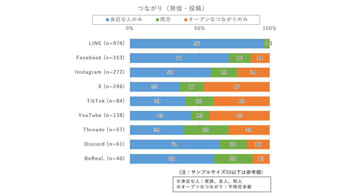 LINEやFacebookでは、家族や友人・知人といった身近な人との利用が中心だった。特に、発信・投稿ではさらに「身近な人のみ」の割合がさらに高くなり、クローズドな環境でのコミュニケーションが特徴的だ。